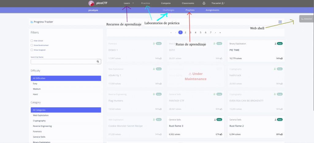 La flecha morada apunta a los recursos de aprendizaje que ya mencioné. Las azules, por su parte, indican la sección de retos: ahí podremos filtrar los retos por dificultad y categoría como se observa en la parte izquierda de la imagen. La flecha roja apunta a una subsección de la pestaña “practice” donde encontraremos retos reunidos en rutas de aprendizaje, esto al conjuntarlo con los apuntes Primer de la pestaña “Learn” se convierte en un poderoso recurso para entender la seguridad y cómo funciona. Finalmente, la flecha verde apunta a una pestaña llamada “Web Shell”, al dar click en ella se nos prestará una shell interactiva que sirve para resolver los retos en caso de no contar con una consola en nuestro equipo o en caso de no poder usar nuestra propia consola por motivos de privilegios, por ejemplo.